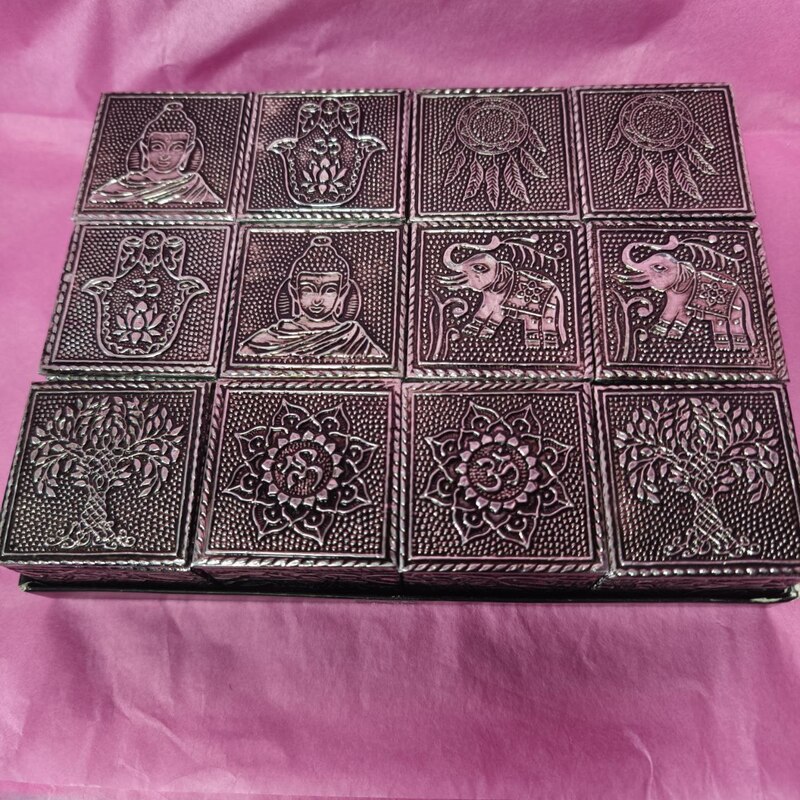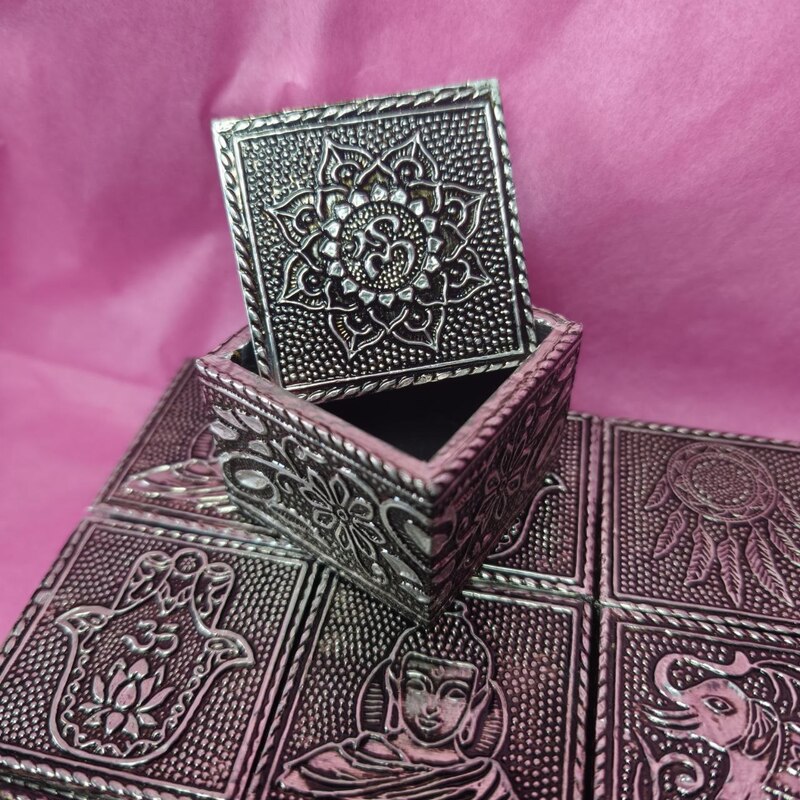 CAJA GRANDE HEXAGONAL PLATEADA SOBRE RELIEVE ÁRBOL DE LA VIDA . ALPACA HECHA A MANO.