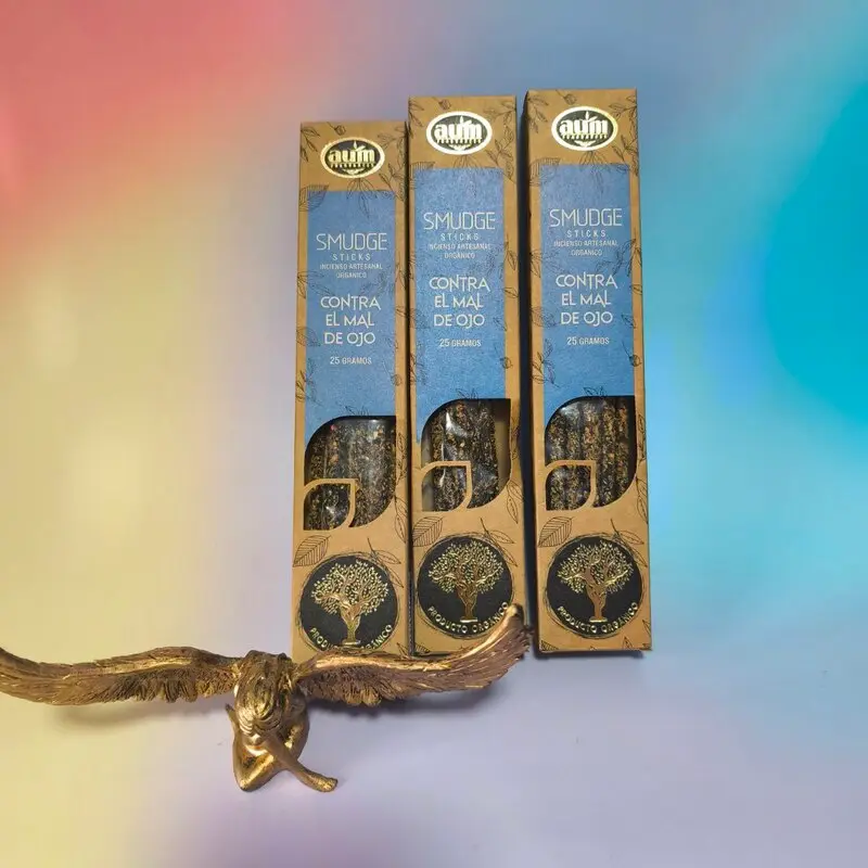 Este incienso ha sido creado como un escudo energético de protección frente al mal de ojo, envidias y vibraciones negativas. Sus varillas gruesas, elaboradas con ingredientes orgánicos, desprenden un humo sagrado que purifica el ambiente y fortalece el aura. La fragancia AUM, inspirada en la vibración primordial del universo, conecta con la energía de la protección ancestral y la armonía espiritual.