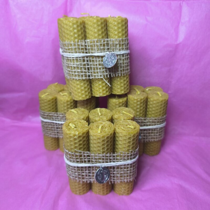 PACK DE 6 VELAS ARTESANALES MIEL PANAL CON AMULETO DOBLE CARA SAN BENITO 6 UNIDADES 10X3