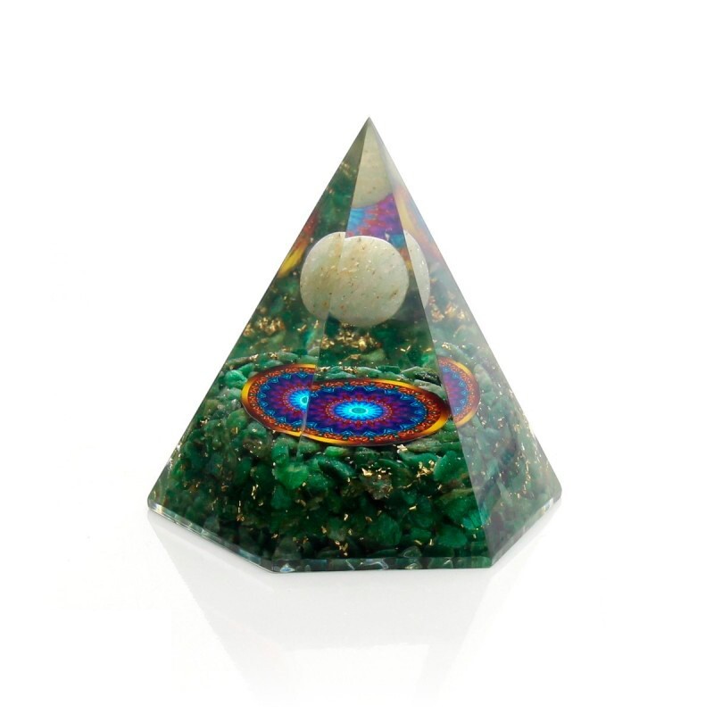 Esta pirámide de orgonita ha sido elaborada artesanalmente en forma octogonal para expandir la energía en todas las direcciones, creando un campo vibracional estable y armonioso. En su núcleo, el jade verde actúa como piedra de sanación, prosperidad y equilibrio emocional, conectando directamente con el chakra corazón y favoreciendo la paz interior.