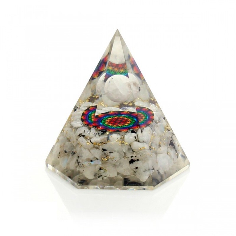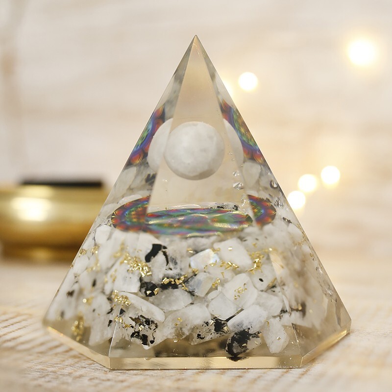 Esta pirámide de orgonita ha sido elaborada artesanalmente en forma octogonal para canalizar la energía en todas las direcciones, creando un campo vibracional armónico y protector. En su núcleo, la piedra luna actúa como cristal de sensibilidad espiritual, conexión con lo femenino y apertura intuitiva. Es ideal para quienes buscan armonizar emociones, potenciar su intuición y conectar con los ciclos naturales.