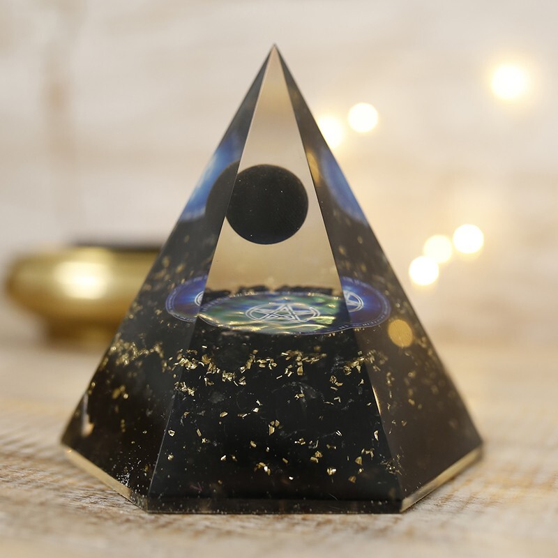 Esta pirámide de orgonita ha sido diseñada en forma octogonal para potenciar la armonía multidimensional y canalizar la energía de forma equilibrada. En su núcleo, la turmalina negra actúa como un escudo vibracional, absorbiendo y transmutando energías negativas, mientras que la estructura de orgonita amplifica su poder y lo distribuye en el entorno.