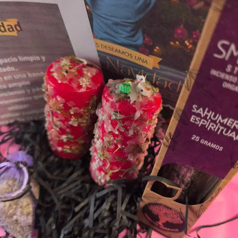 2 Velones Rojos Ungidos y Ritualizados Representan el fuego sagrado de la vida, la sangre ancestral y la voluntad divina. Uno se enciende en Navidad (25 de diciembre) para honrar el renacimiento de la luz; el otro en Año Nuevo (1 de enero) para sellar los propósitos del nuevo ciclo.