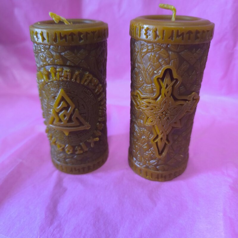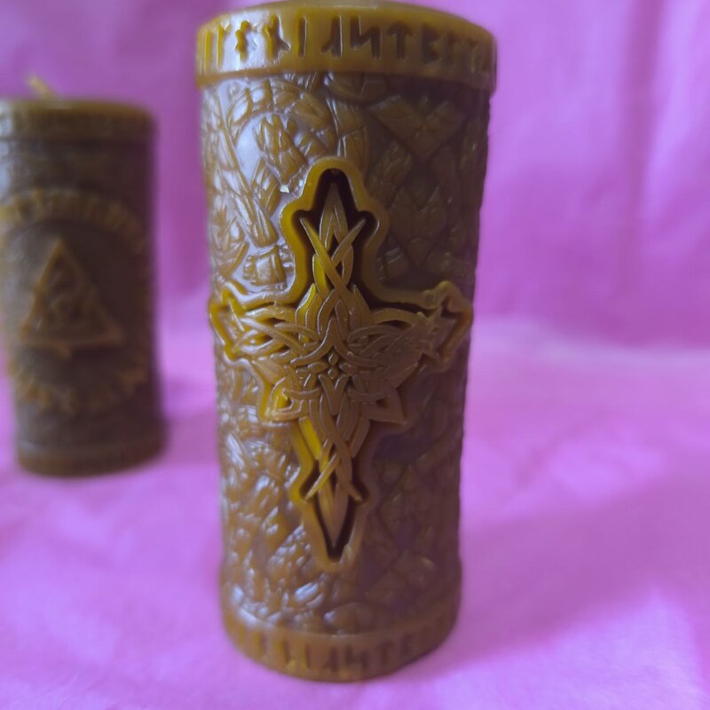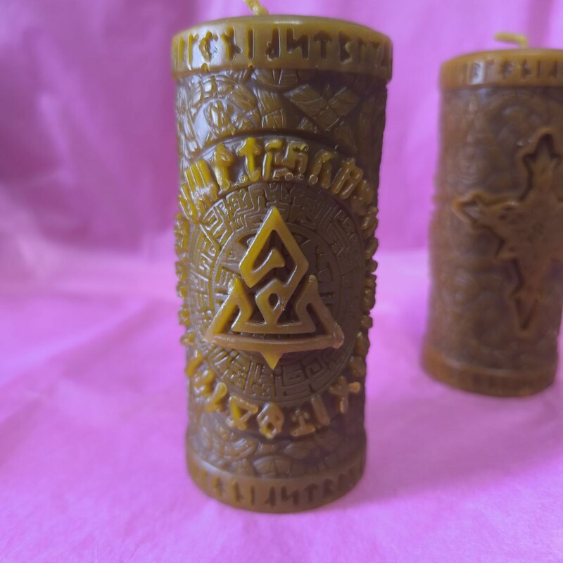 VELÓN INTENCIONADO LAS RUNAS VIKINGAS. VALKUR Y ESTRELLA DEL NORTE. CERA MIEL NATURAL ARTESANA. CERA MACIZA LARGA DURACIÓN. 12X6 CM